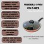 Frigideira 4 em 1 Multiuso com Divisória Antiaderente faz Ovos e Hamburgers, acompanha tampa de vidro temperado com Saída de vapor, o que permite visualizar o processo de cozimento dos alimentos. Design arrojado, beleza e muito charme, o diferencial desse Item, está em seu material, alumínio de alta qualidade, espessura de 1,1 mm, que confere ao item uma estrutura resistente garantindo a durabilidade e distribuição eficiente do calor, proporcionando o cozimento mais rápido e uniforme dos alimentos. Revestido com 5 camadas de antiaderente TEFLON (DuPont) – PFOA Free, internamente e externamente, evitando que o alimento grude na superfície, o que possibilita o preparo dos alimentos com menos gordura, além de proporcionar praticidade no momento da limpeza. Possui cabo reforçado ergonômico, feito em baquelite, material antitérmico que não retém calor, para garantir facilidade e máxima segurança no manuseio.